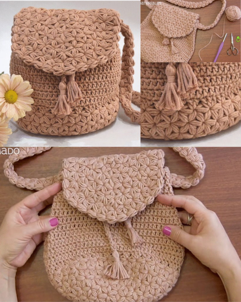 Small backpacks are all the rage these days, but this chic design stands out from the crowd. Crafted with the intricate crochet jasmine stitch, this bag exudes a unique blend of tribal charm and vintage elegance you won’t find anywhere else.