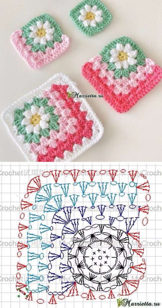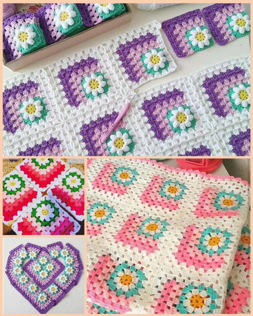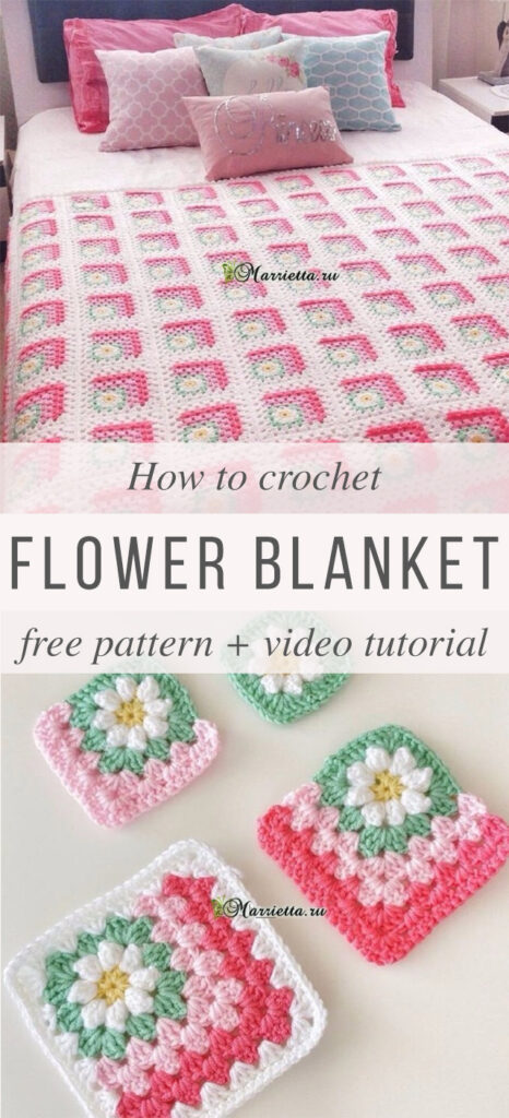 Source of flower crochet granny blanket: Elena Fominyih and flower crochet granny square tutorial: Andreiia Arts.