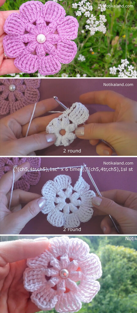 There are no limits to creativity when crocheting these delightful flowers! You can use any color you like, and they’ll always turn out stunning. For a unique twist, try using yarn with a touch of glitter—it adds a shimmering effect that makes the flowers pop against solid colors. Under sunlight, these glittery crochet flowers sparkle beautifully, creating a truly eye-catching effect. For an extra touch of elegance, consider adding beads or a pearl to the center of each flower.