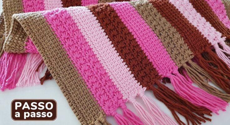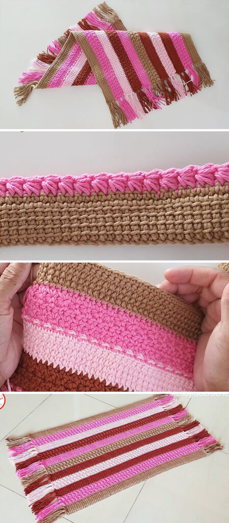 To create the Tunisian crochet carpet, gather these yarn colors: 140g (160 meters) of brown, 140g (160 meters) of rose, 140g (160 meters) of burgundy, and 90g (100 meters) of hot pink. You’ll also need a 3.5mm crochet hook, scissors, and a tapestry needle for cutting and finishing.