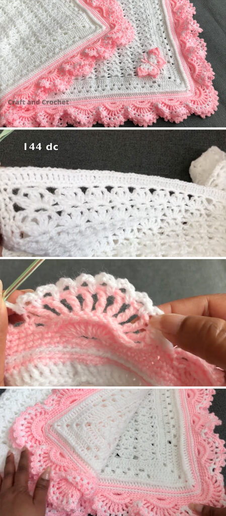 Take pink yarn into the hook and make single crochet around the blanket. When you start the next row with same yarn, make 10 sc, then chain 4, skip 4 single crochet and insert the chain 4 into the 5th single crochet. Repeat this pattern all around. In this way, you will get loops.
