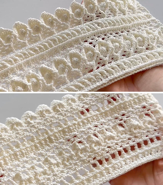 These lace crochet patterns are simple to create and ideal for enhancing crochet and fabric designs. They are durable, easy to clean, and perfect for long-term use. This versatile lace crochet pattern works wonderfully for various projects, such as adding elegant borders to skirts, shirts, and sweaters. Personally, I love using it to embellish beach hats due to its light and airy texture. While it might appear challenging at first, I found it surprisingly easy to master with a bit of practice. To make it easier for you, I’ve included a detailed pattern with clear, step-by-step instructions. If you still encounter any difficulties, a comprehensive video tutorial is also available to guide you through the process.