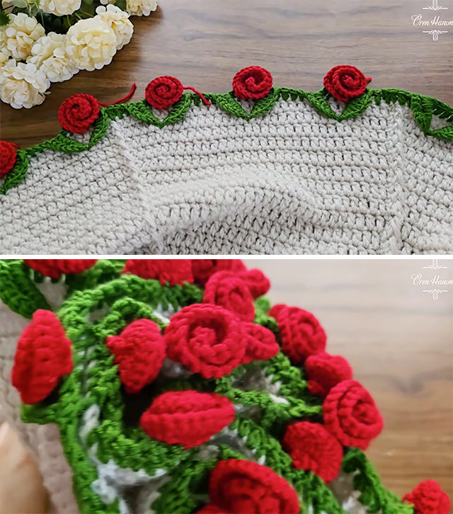 The roses are made by crocheting a long strip of half-double crochet stitches, then rolling the strip into a spiral to form the bloom. Sew the base of each rose securely to hold its shape. These roses are then sewn or crocheted onto the vine at regular intervals — ideally at each corner and evenly along the sides. - Step 3: Attach the Edging