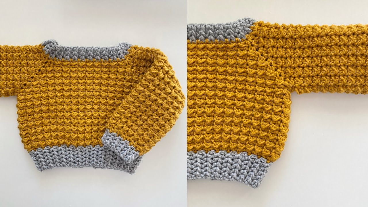 This sweater is typically made top-down or in panels, using worsted or DK weight yarn and a 4.5 mm–5.5 mm hook. The yoke is formed first with increases at the raglan points (if top-down), or the front/back panels are made separately and then seamed. The even moss stitch gives the entire sweater a neat, modern texture without needing fancy stitch work or complicated shaping. Once the sleeves and body are done, the neckline and cuffs can be finished with simple single crochet or slip stitch ribbing for a clean edge.