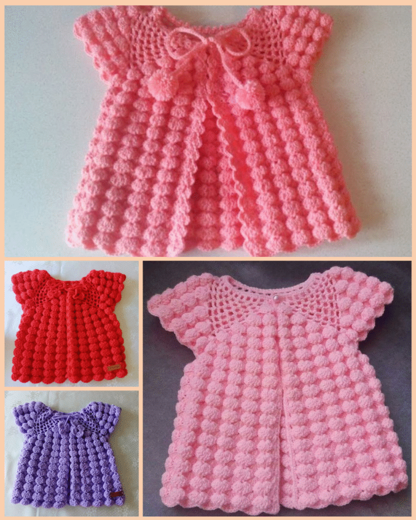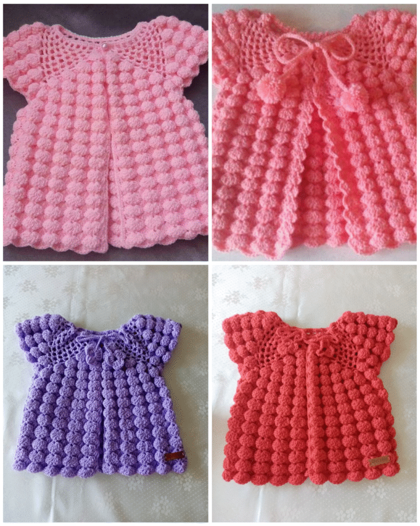 Start by choosing your favorite yarn color—bright hot pink, as shown in the video, is a popular choice! This design doesn’t require buttons. Instead, it features a simple 30 cm butterfly-style tie at the neckline, finished with two cute pom-poms. The dress’s standout texture comes from its puffed, 3D look, giving it both beauty and depth.