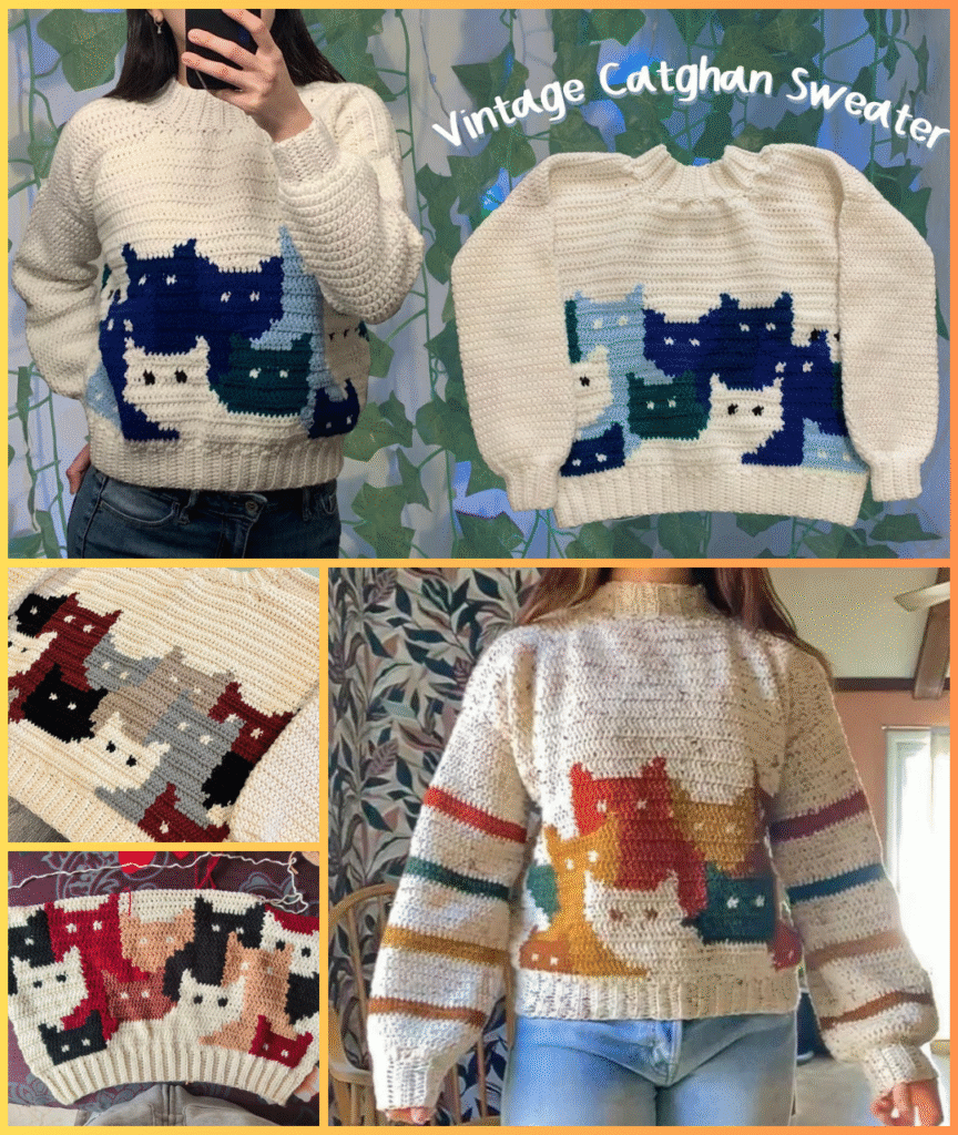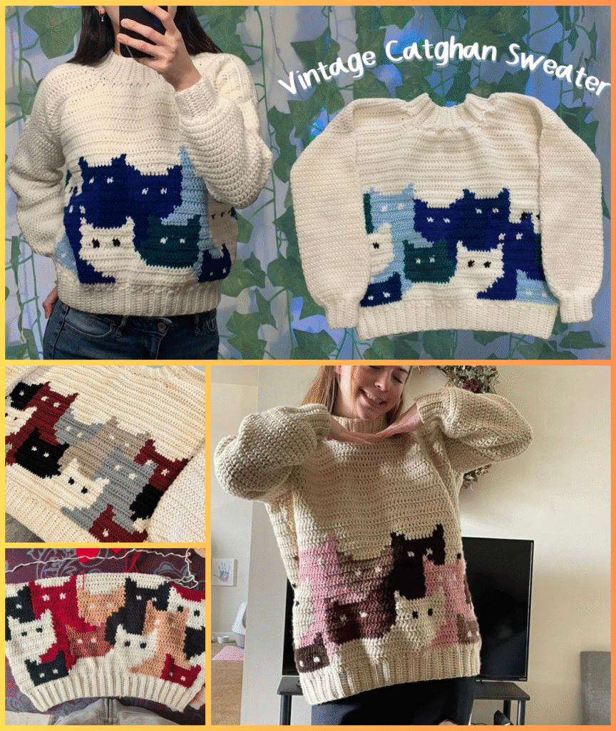 Whether you’re a cat lover, a vintage enthusiast, or just looking to make a quirky statement, this crochet sweater bursting with kittens is purr-fectly charming and surprisingly simple to customize.