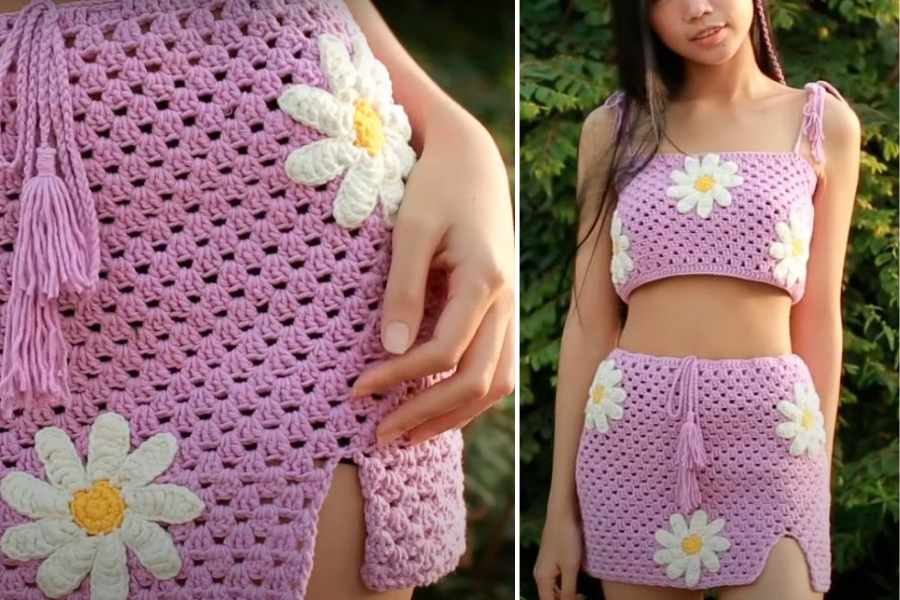 This skirt is made from crocheted floral granny squares that are stitched together and finished with a waistband and hem. It can be lined or worn with bike shorts underneath.