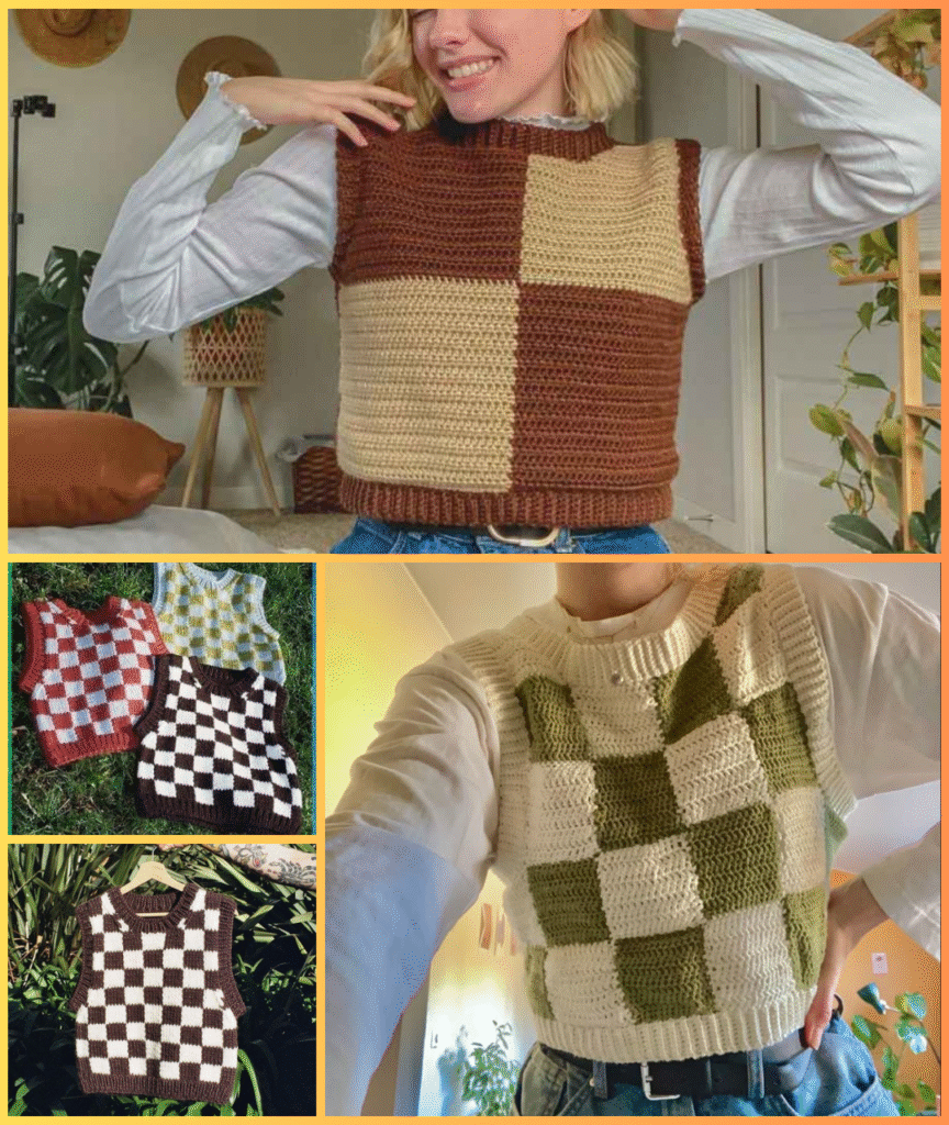 And there you have it — a bold, modern Crochet Checkerboard Sweater Vest made from simple squares! This project is perfect for experimenting with color and learning how to join motifs. Whether you pair it with jeans, skirts, or layer it over a turtleneck, your handmade vest will be a stylish statement all year round.