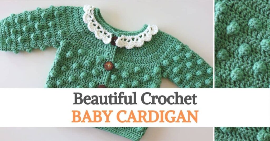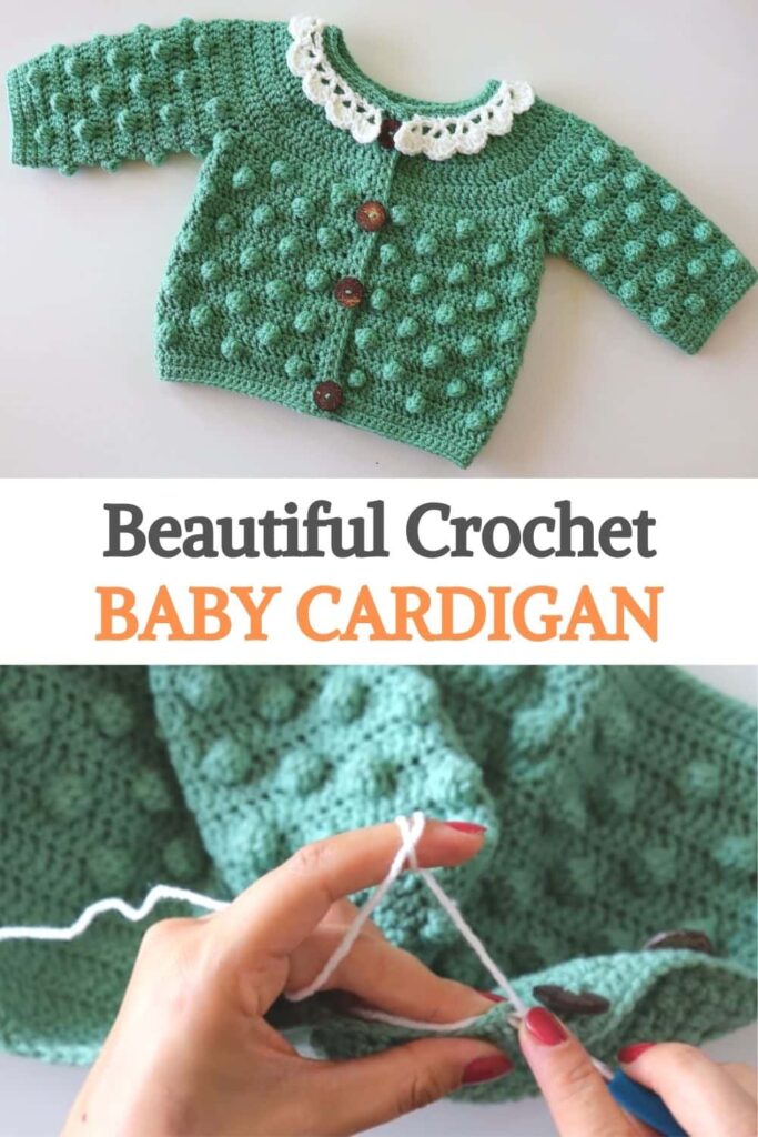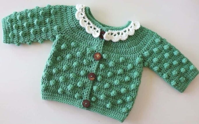Once the body and sleeves are complete, the cardigan is finished with a border around the front and neck edges, often using single crochet or shell stitch. Buttonholes can be added during this edging stage, and cute buttons—like flowers or wooden ones—add the final touch. This cardigan makes a lovely handmade gift and is ideal for babies 0–12 months, though the pattern can be easily adjusted for larger sizes. The textured bobble stitch gives it a handcrafted, boutique-quality finish that stands out in any baby wardrobe.