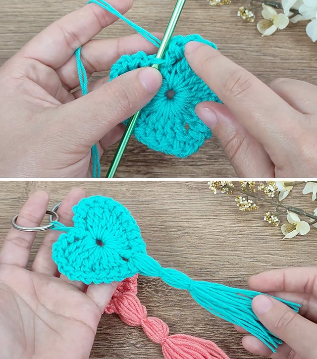 – Cut 12 pieces with 35cm length, using tapestry needle, insert the strands in the needle, pass the needle through the base of the heart, cut another 2 pieces of yarn, wrap one of them 2cm down and tie, wrap the second one 2cm down and tie, secure them, fasten off. Trim ends evenly.