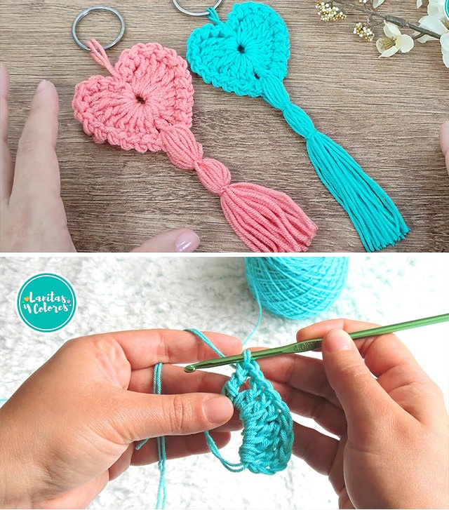 Tutorial and photos of this crochet heart keychain pattern by: Lanitas y colores.