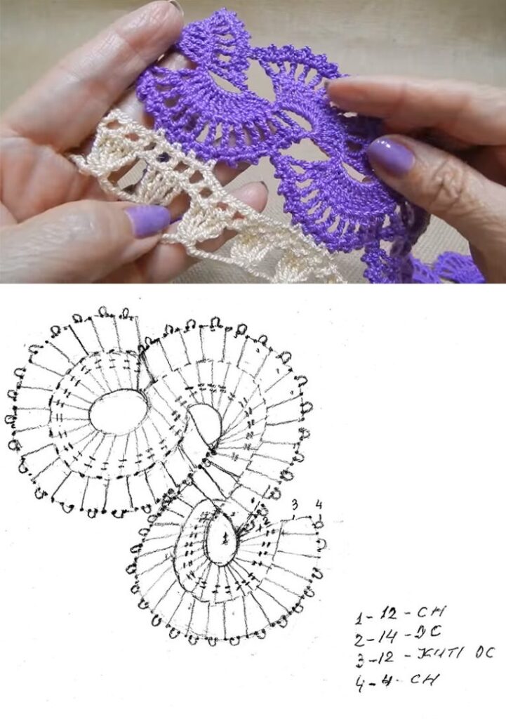 - On the arch with 7 CN, crochet DC 14 ( same as #3 ). Continue like this. When you finished, crochet the borders of the chain as shown in the video