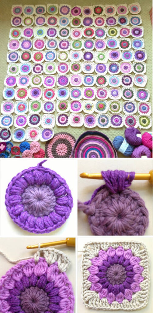 Source of sunburst granny square tutorials: Bella Coco. Here you can find Part 2 and Part 3.