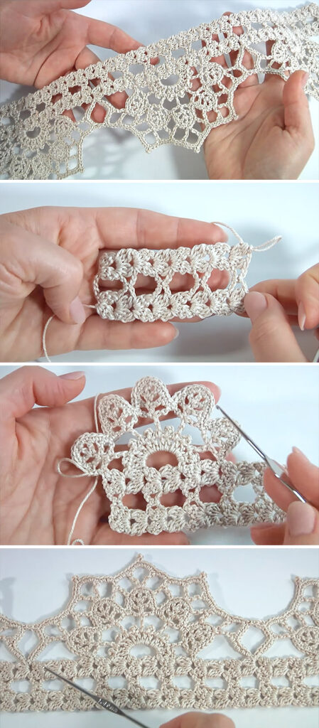 Working these clusters in a rhythmic flow gives the lace a scalloped effect, which is especially eye-catching along fabric edges or garments.